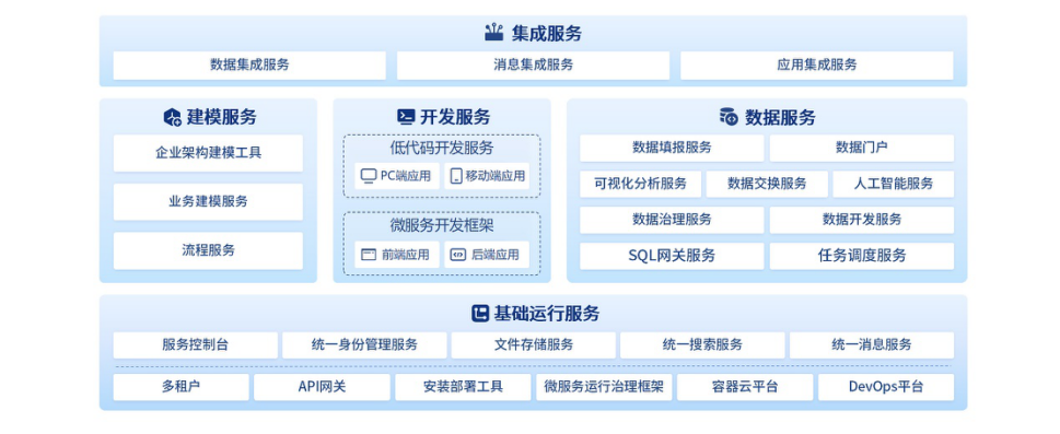 ASP+基礎(chǔ)運(yùn)行服務(wù):提供了云原生、微服務(wù)、組件化、服務(wù)化等基礎(chǔ)運(yùn)行環(huán)境和可復(fù)用的基礎(chǔ)技術(shù)組件、可共享的技術(shù)服務(wù),為用戶(hù)業(yè)務(wù)系統(tǒng)建設(shè),從平臺(tái)層面實(shí)現(xiàn)環(huán)境適配能力和全面安全保障能力。