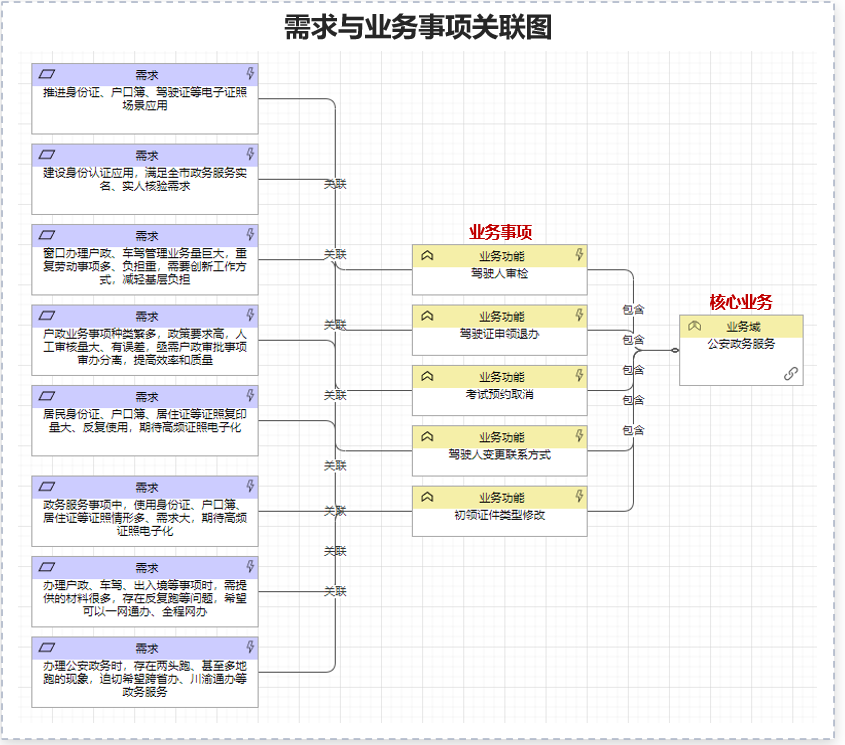 需求與業(yè)務事項關聯:通過工具將重大需求關聯到核心業(yè)務及業(yè)務事項。定準核心業(yè)務是“V”模型應用的起點,從需求出發(fā),謀劃多跨場景的第一步就是要找到場景所在的核心業(yè)務和事項,自此開始對業(yè)務進行多跨場景的拆解和集成。