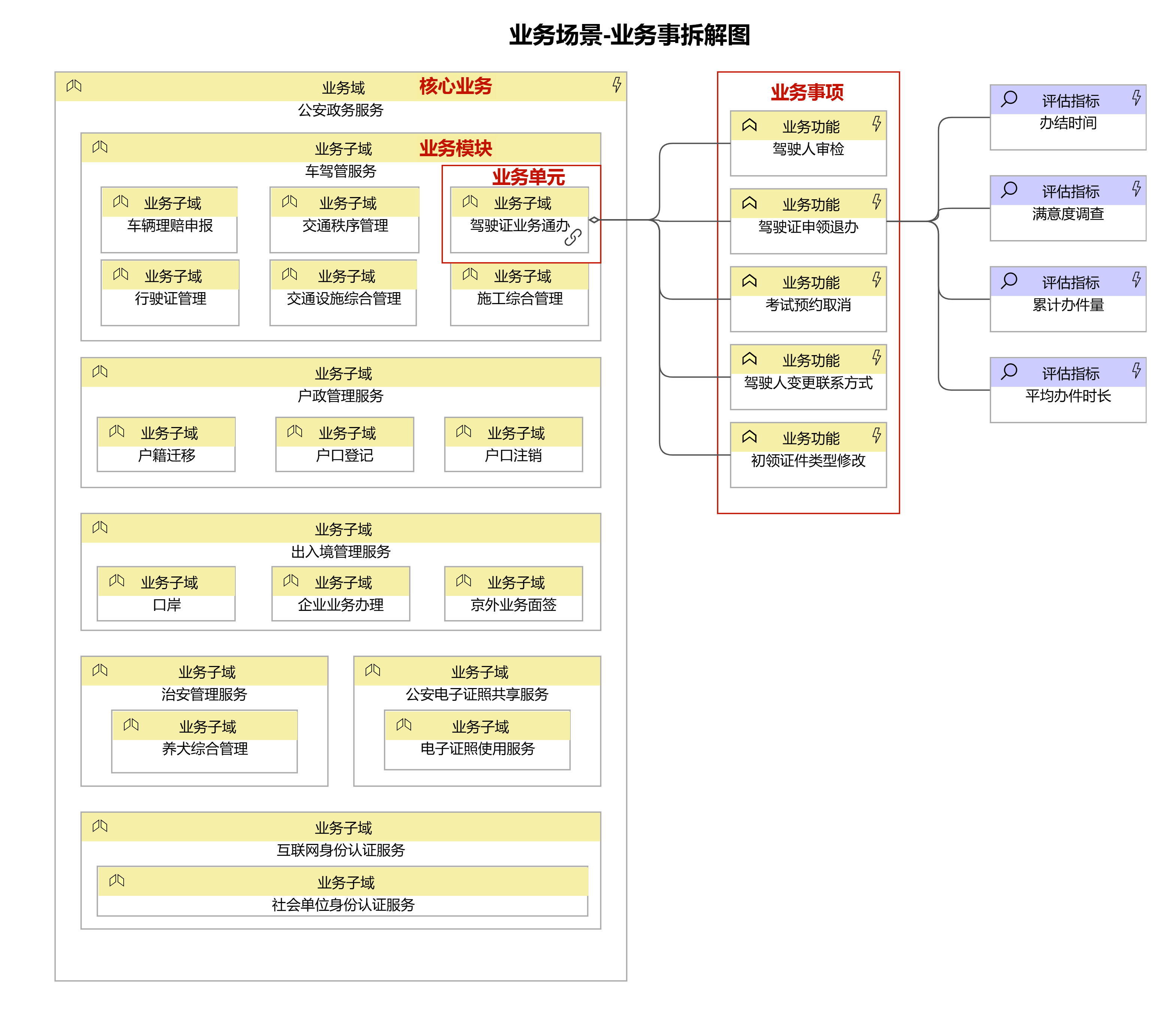 業(yè)務場景與事項拆解:從“大場景”中尋找“小切口”,對核心業(yè)務逐層拆解出業(yè)務場景、業(yè)務單元,直至最小級別的業(yè)務事項。最小級別的業(yè)務事項可以理解為單個部門履職具體化的最小單元,它關聯了主責部門、使用的數據等要素。對多個業(yè)務事項編排,形成解決特定業(yè)務需求的流程。因此,謀劃多跨協(xié)同場景需要將業(yè)務拆解到最小級別的業(yè)務事項才能滿足要求。