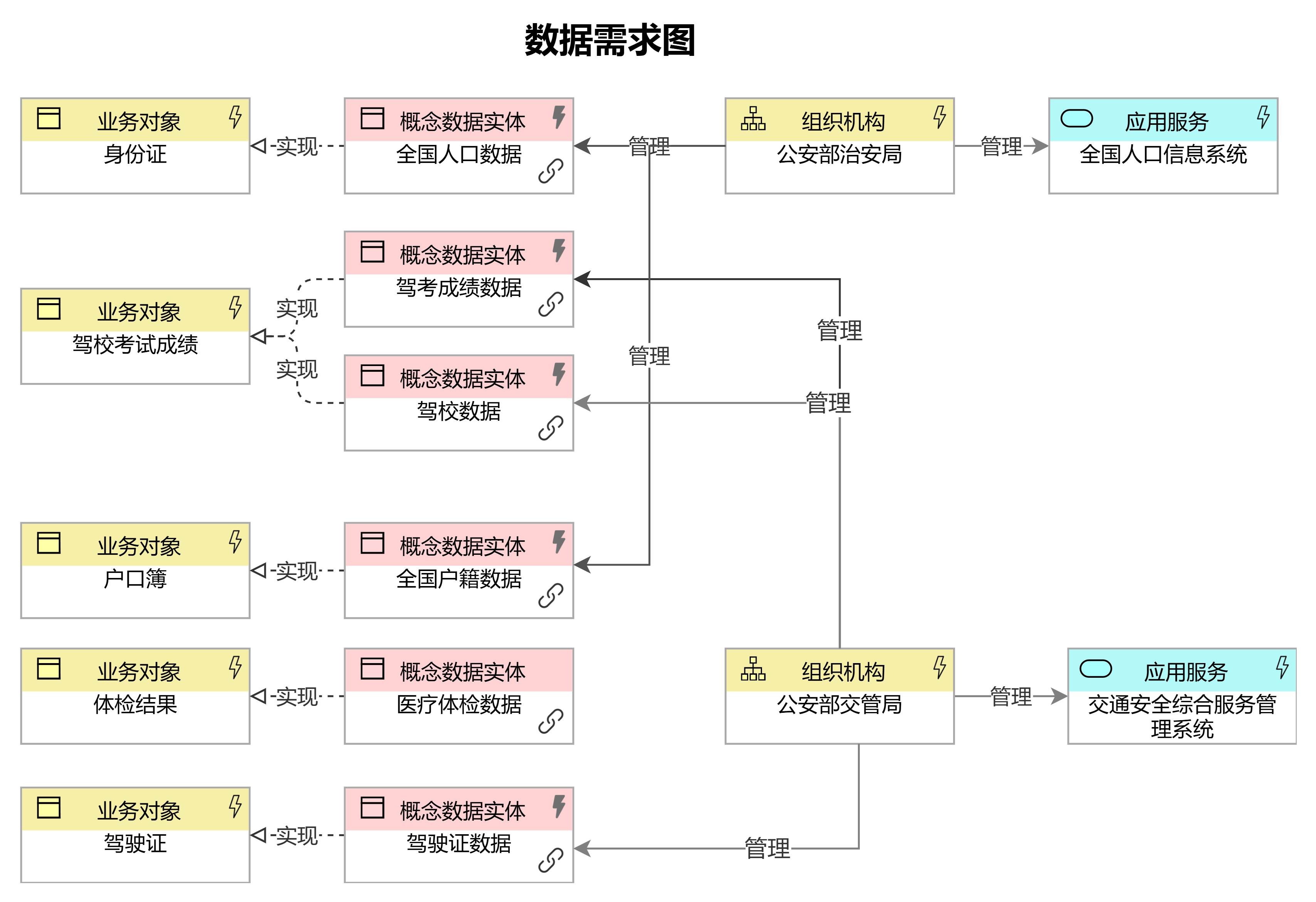 數據需求清單:對流程中涉及的業(yè)務對象進行數據來源分析,找出業(yè)務對象對應的數據、數據所在的應用系統(tǒng)、以及責任主體,由此形成數據需求清單。數據需求清單是“V”模型上行階段工作的開端,通過數據需求可以發(fā)現有協(xié)同關系的部門,發(fā)現潛在的數據集成需求。