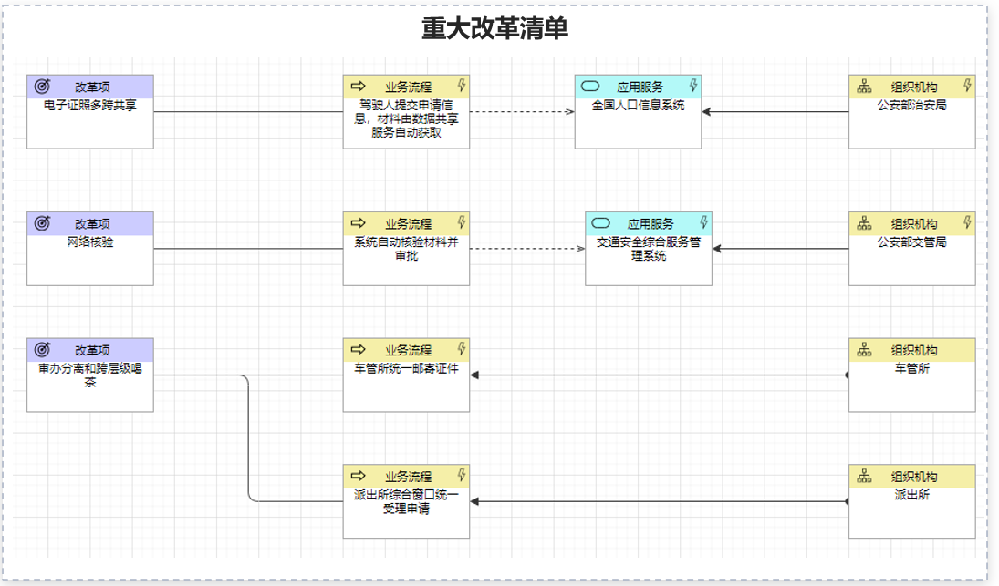 將再造流程中的創(chuàng)新點關聯到涉及的應用系統(tǒng)以及主管部門,即可形成完整的改革項,最終作為梳理重大改革清單的素材。